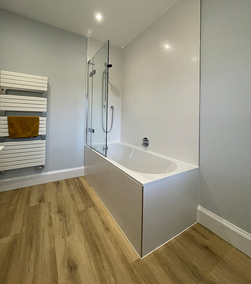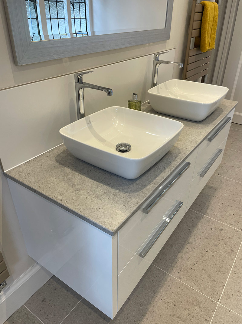 The family bathroom required a removal of an internal wall and bespoke pieces that were made to fit the intricate internal structures of their property. We were able to create space for a bath and large wet room, walk in shower by working with our suppliers, Matki, to create the perfect fit. We were pleased with how the high specification sanitaryware, and furniture worked with the internal design features to maximize the space and overall practicalities whilst maintaining a feeling of space and quality. The clients chose neutral tile colours as well as Vanity Hall painted furniture to match and compliment the overall design.