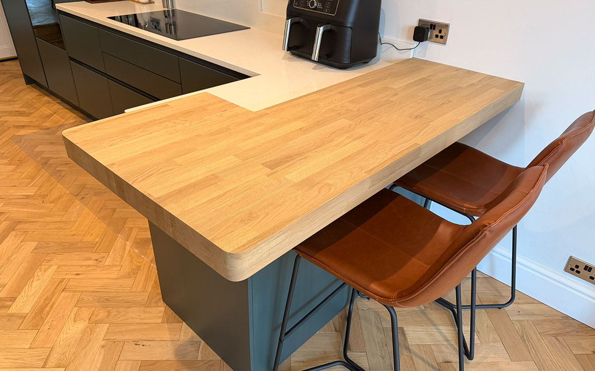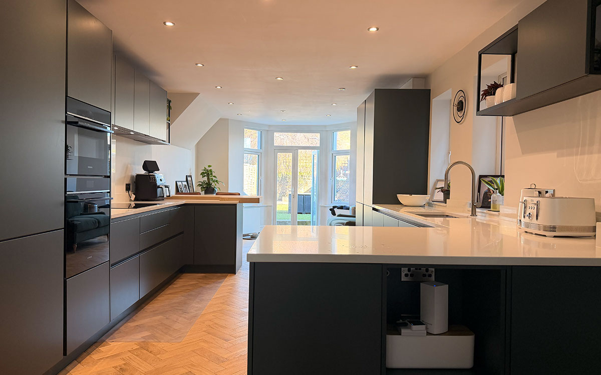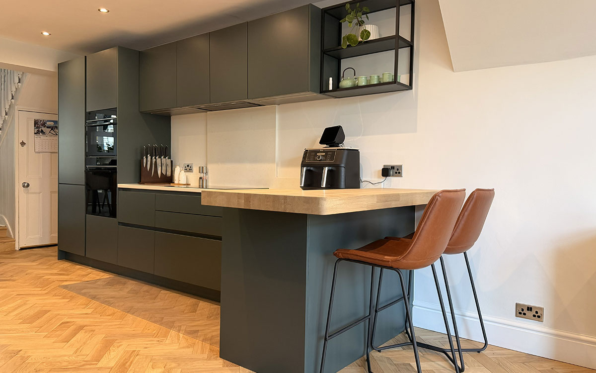 This contemporary kitchen was part of a complete house renovation. The stylish Nolte German handleless kitchen in ‘The 2025’ trend colour - Black Green gave this kitchen a modern look. Integrated Siemens appliances with an Induction Hob. The Quooker boiling tap and Bianco stainless steel undermount sink gave this kitchen a minimal yet practical design. Solid Oak Spekva bespoke wood top breakfast bar