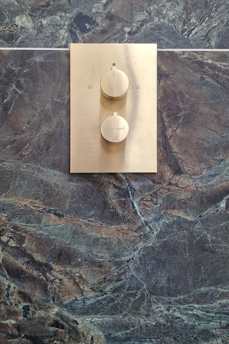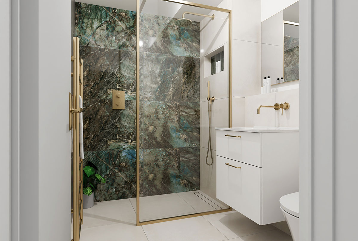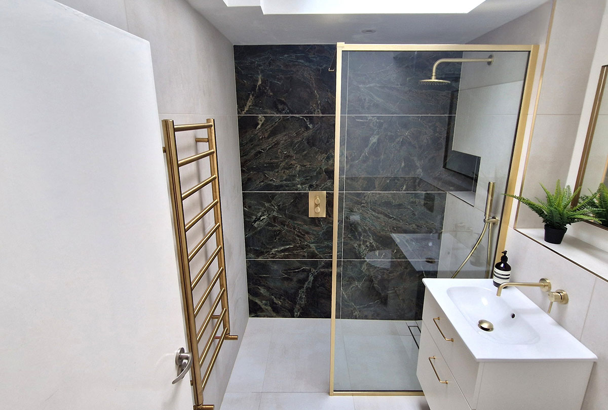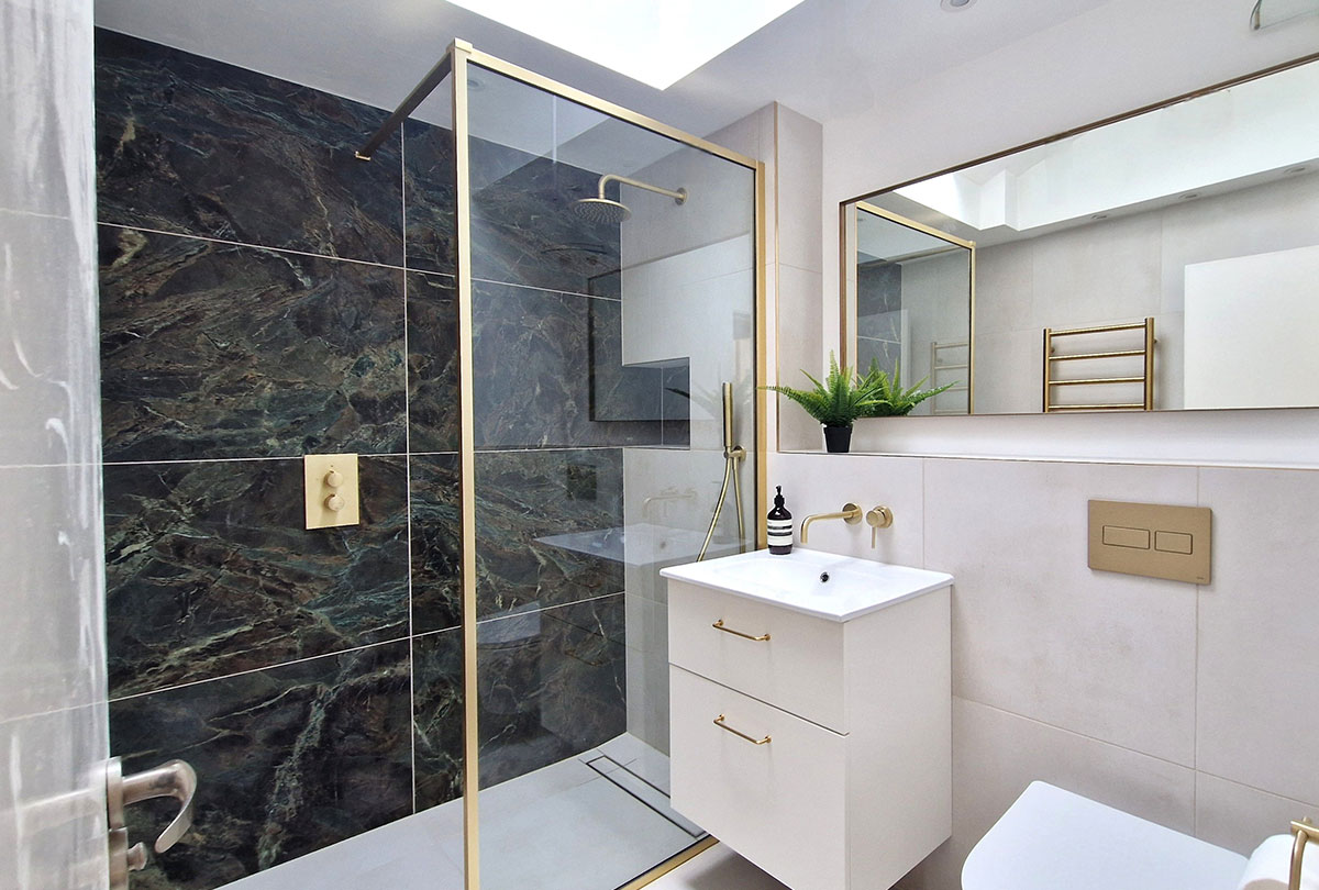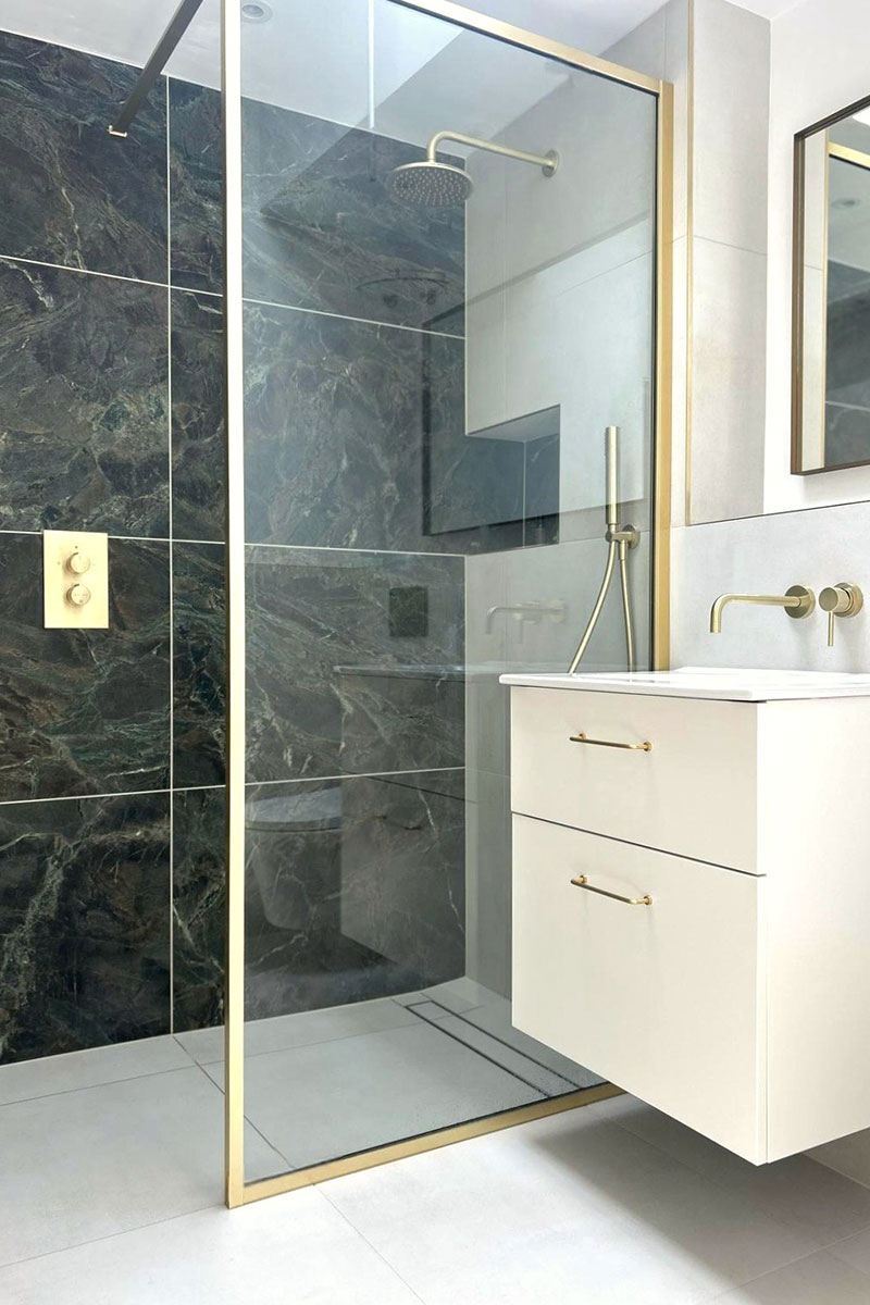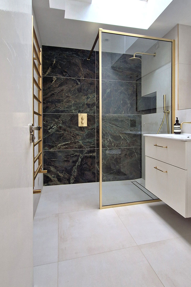 The brief was brass, green and lots of space! We opened up the area in this room by removing some boxing and reconfiguring the shower to change this to a larger walk in shower.