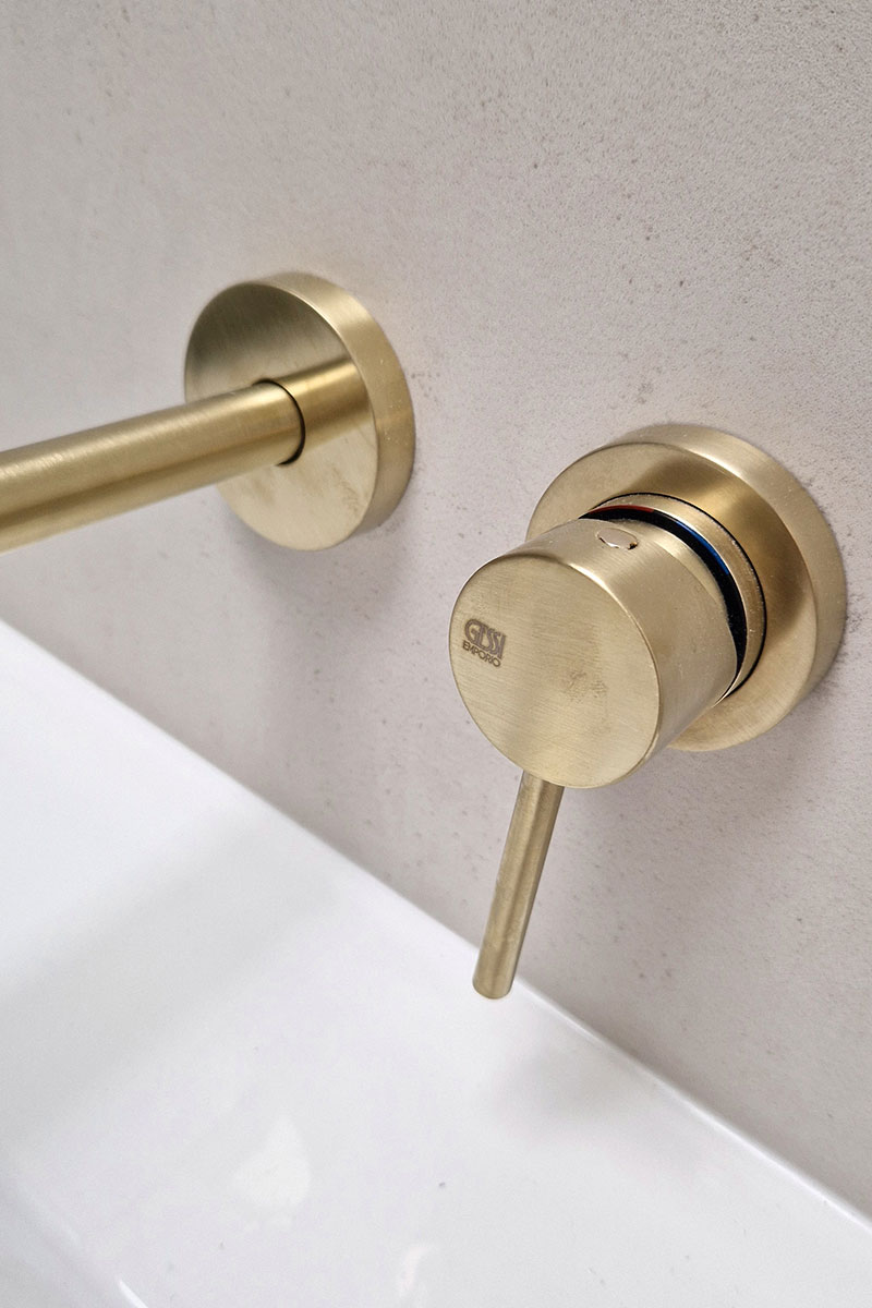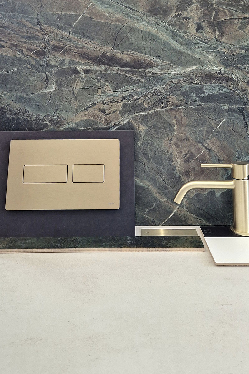 The main tiles and vanity unit were kept simple in nice off white tones to let the brushed brass fixings really stand out - particularly against the green marble tiles in the shower area.